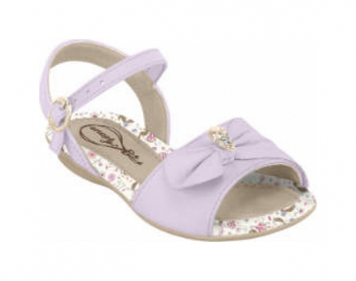 Em cima do pé tem um detalhe no mesmo material e cor da sandália que acaba em um franzido em cima do pé com uma bonequinha e com oito strass para dar acabamento.